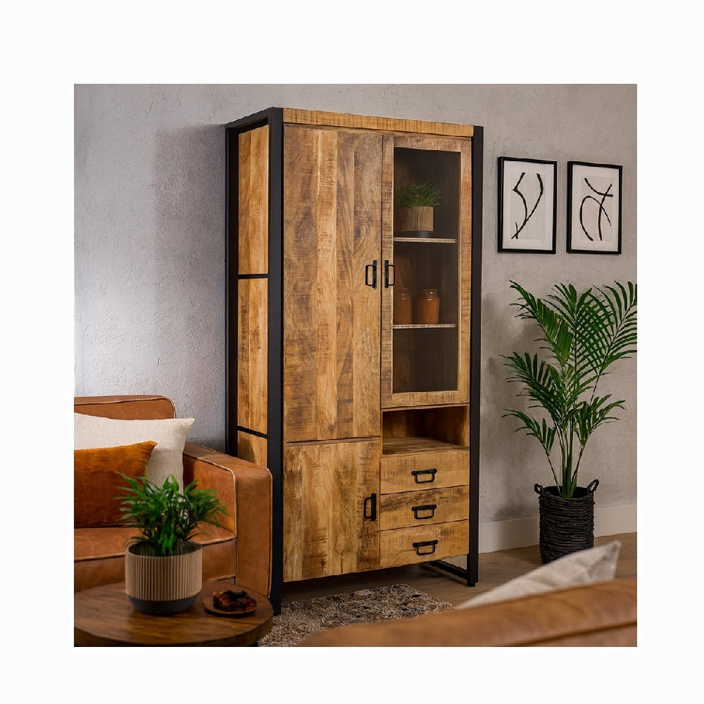De Britt vitrinekast is een ruime, industriële kast van mangohout met een gepoedercoat stalen frame en onderstel. Met drie deuren en drie laden biedt deze kast volop opbergruimte, terwijl de glazen deur zorgt voor een stijlvolle plek om je mooiste items te presenteren.