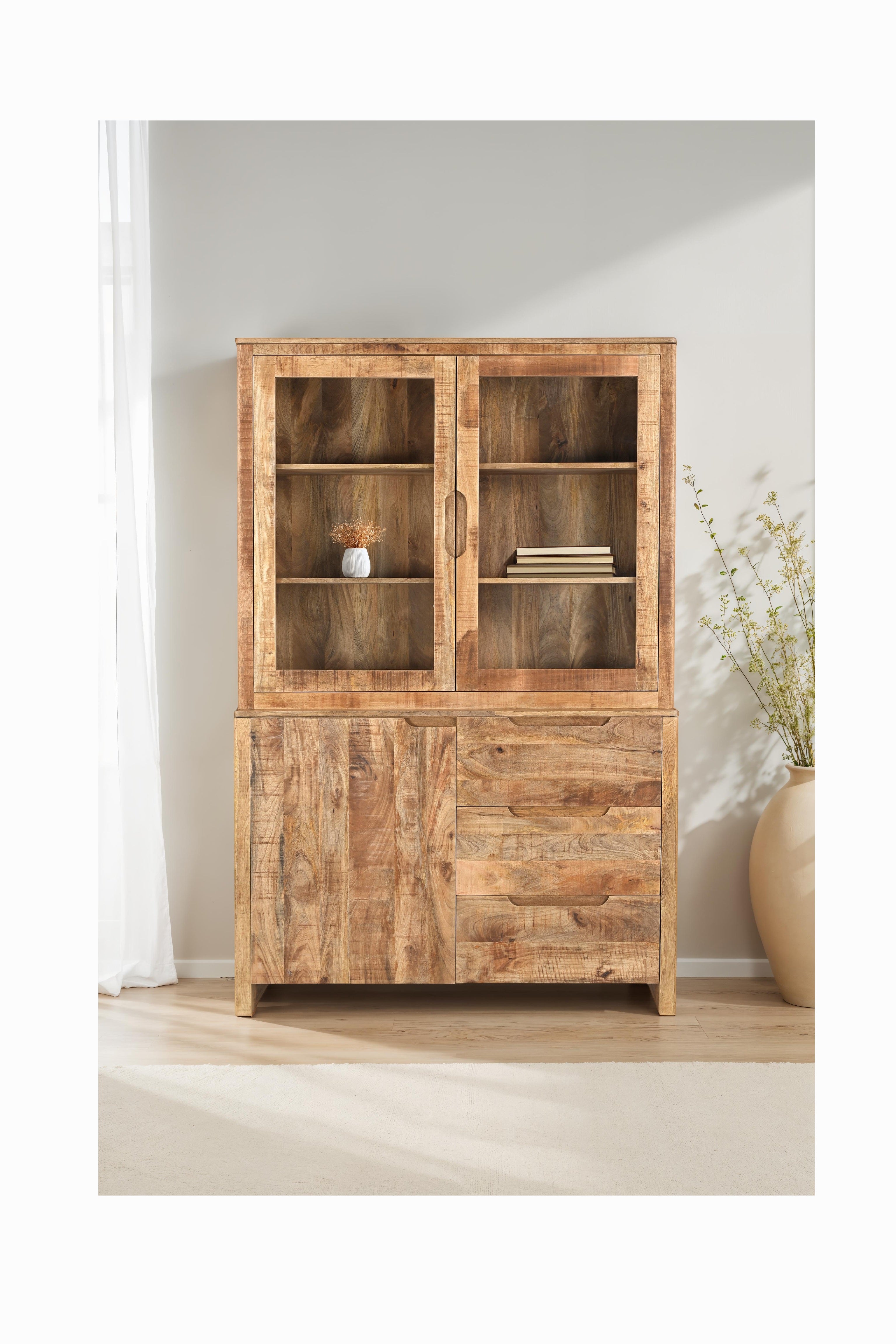 Vitrinekast Sophie biedt een combinatie van open en gesloten opbergruimte. Met glazen deuren bovenin en lades en een kastje onderin is er plek voor zowel wat je wilt tonen als wat je liever uit het zicht houdt. Gemaakt van mango hout en ontworpen met oog voor eenvoud.